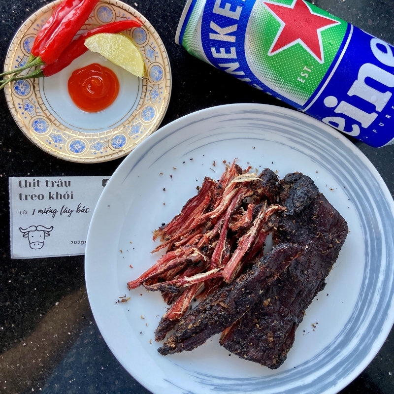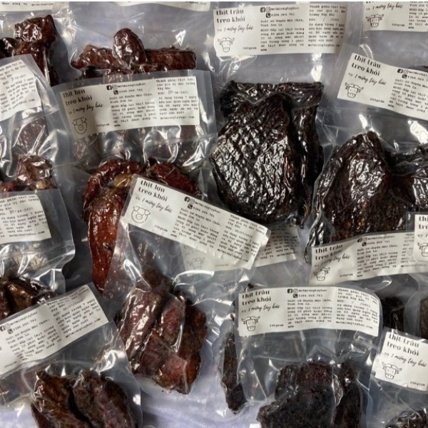 Thịt trâu Treo khói từ Một miếng Tây Bắc được sản xuất thủ công sau đó đóng gói hút chân không và bảo quản lạnh để đảm bảo độ tươi ngon khi đến tay khách hàng