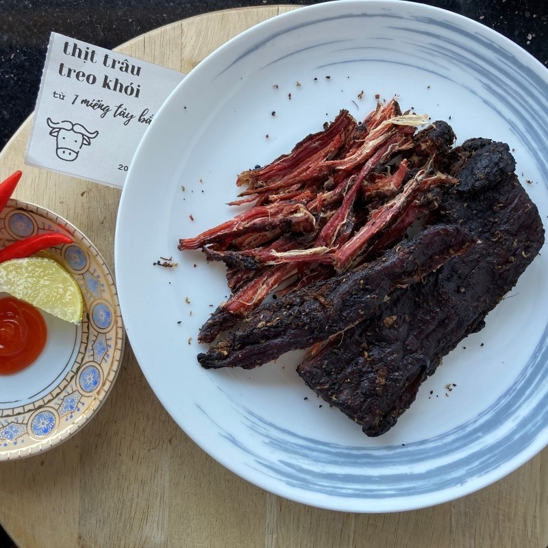 Thịt trâu Treo Khói được làm từ thịt trâu tươi và tẩm ướp các gia vị đặc trưng của vùng núi Tây Bắc